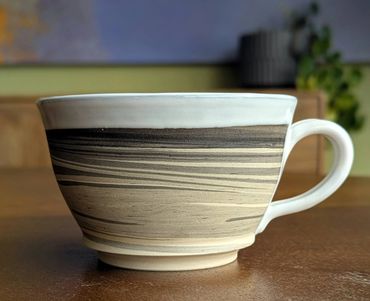 Once at the wheel, I throw each form by hand, setting out to create a cup, a plate, a bowl, with no clear idea of how it will look until it is complete. Each time I pull up the walls, each time it spins, the clays stretch and twist, creating contrast through color and movement. The pattern reveals itself slowly—never all at once—shaped by pressure, speed, and chance. What emerges is a record of th